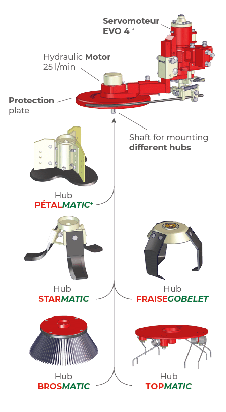 The BIO-MATIC range includes a series of inter-vine rotating tools. From a tool made up of a hydraulic motor, a fastener and a protection plate, it is possible to design different systems with different functions thanks to a range of interchangeable hubs.