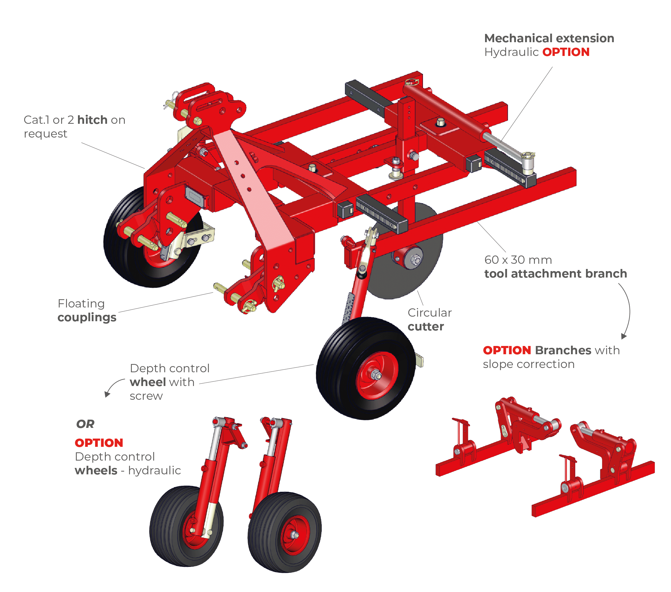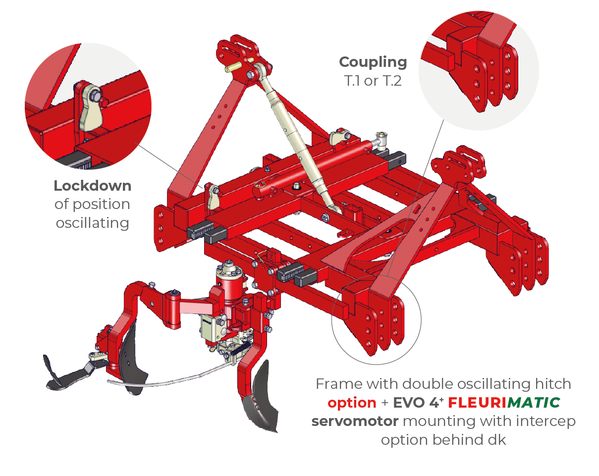 Available on the COMPACT & MEDIUM frames, the oscillating hitch allows for greater working precision when used in a push configuration : pivoting on an axis, the frame follows the unevenness of the ground thanks to its depth control wheels. The movements of the frame become independent from the rigidity of the front hitch.