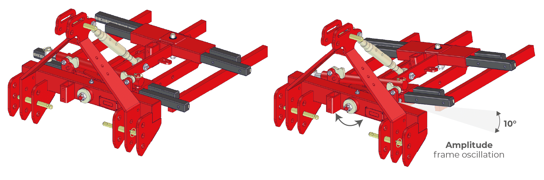 The double hitch has the advantage of being able to use the frame in both pulled and pushed positions. Depending on the tractor, the combination of implements, or the driving habits of the drivers, the frame can be adapted and modulated on demand.