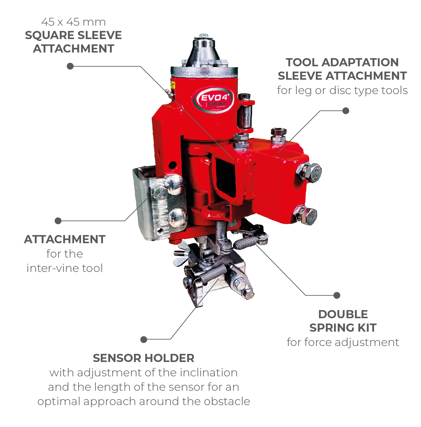 The SERVOMOTOR is a support that allows the adaptation of inter-vine tools (work between plants) designed on the basis of a hydraulic torque amplifier. It is possible to control the movement of the SERVOMOTOR manually, hydraulically or hydro-electrically in order to cause the tool to be retracted in action.