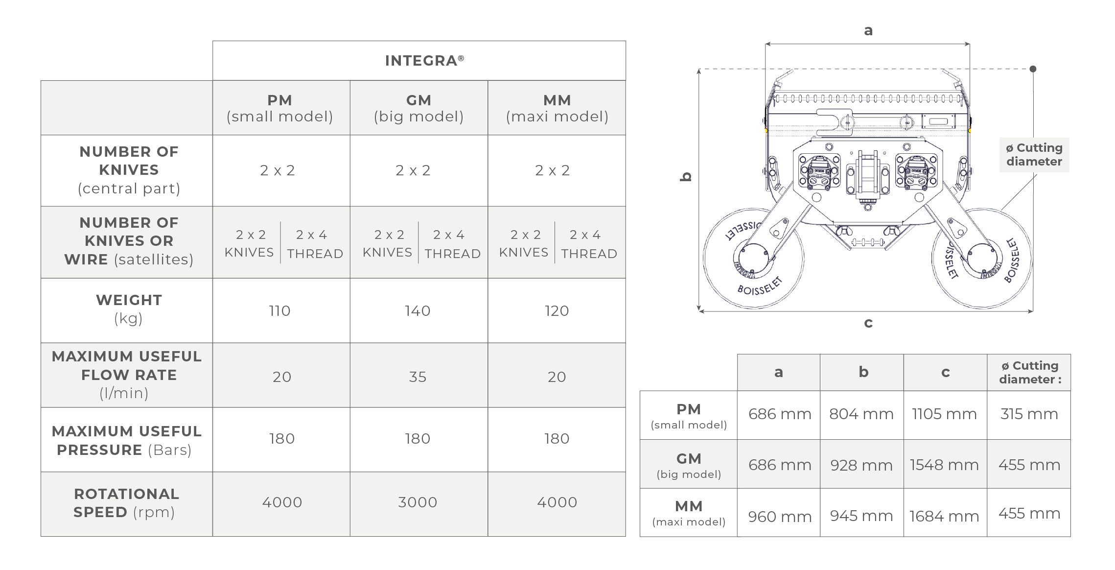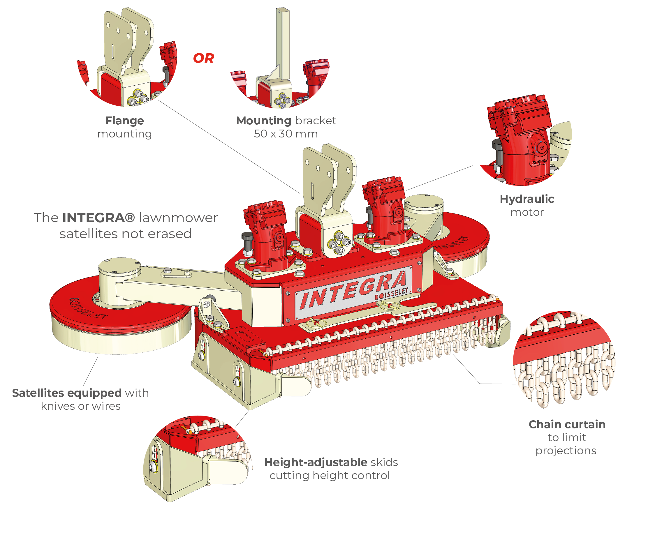 It is equipped with 2 holders blades (equipped with 2 knives each) for the central part and satellites equipped with knives or wires thus allowing full mowing work to be carried out.