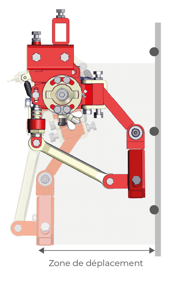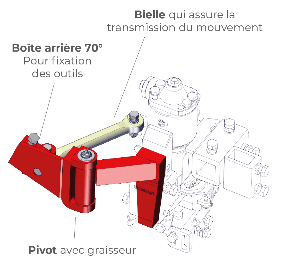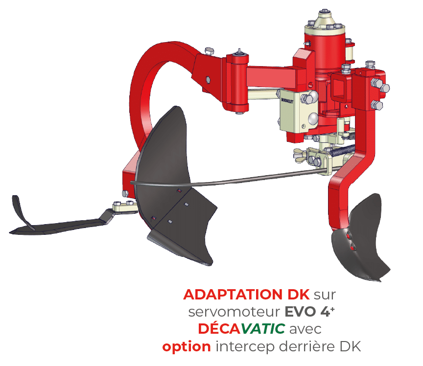 « L’ADAPTATION DK est un système qui transforme le mouvement rotatif du servomoteur en un mouvement parallèle au rang de plantation.