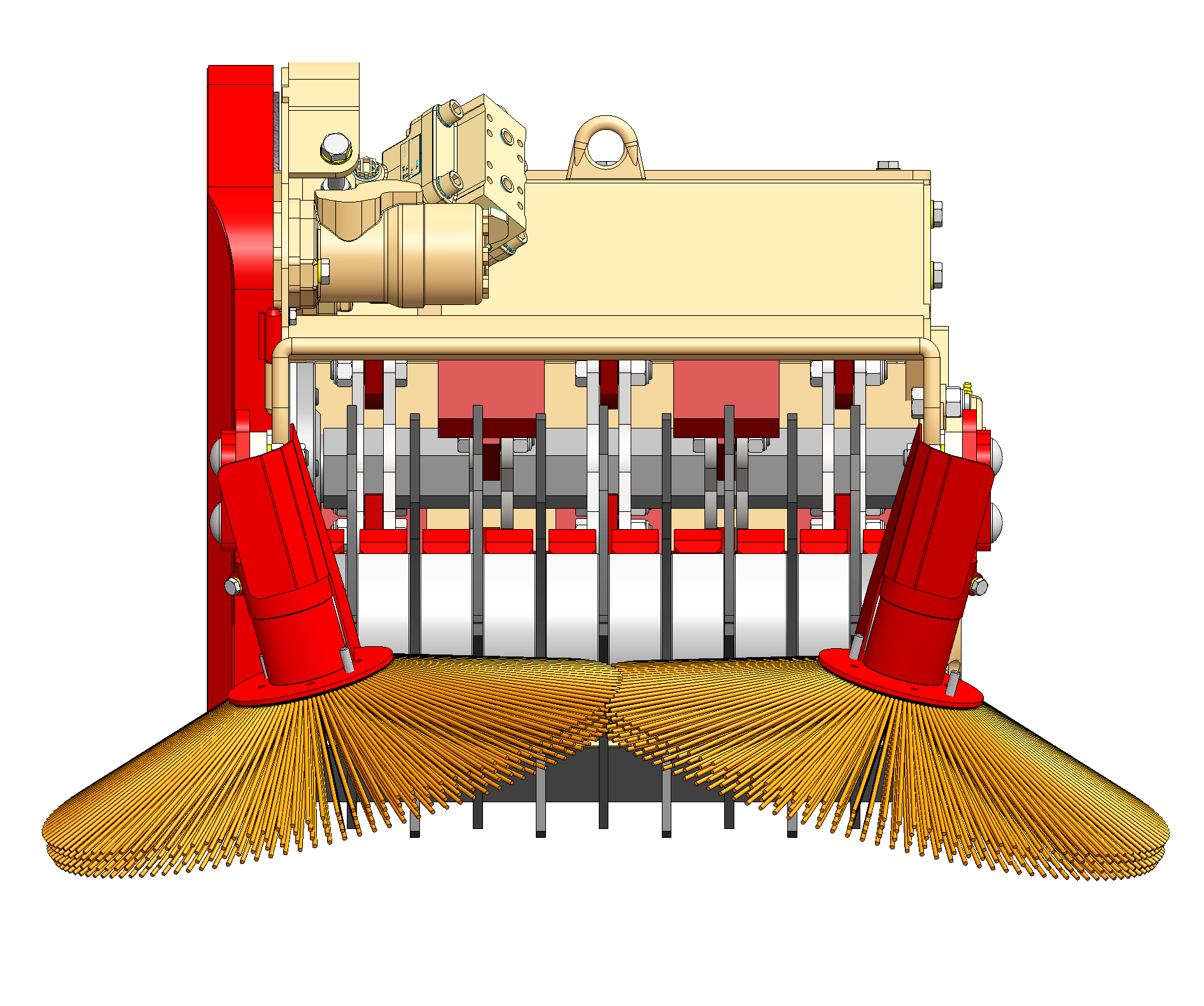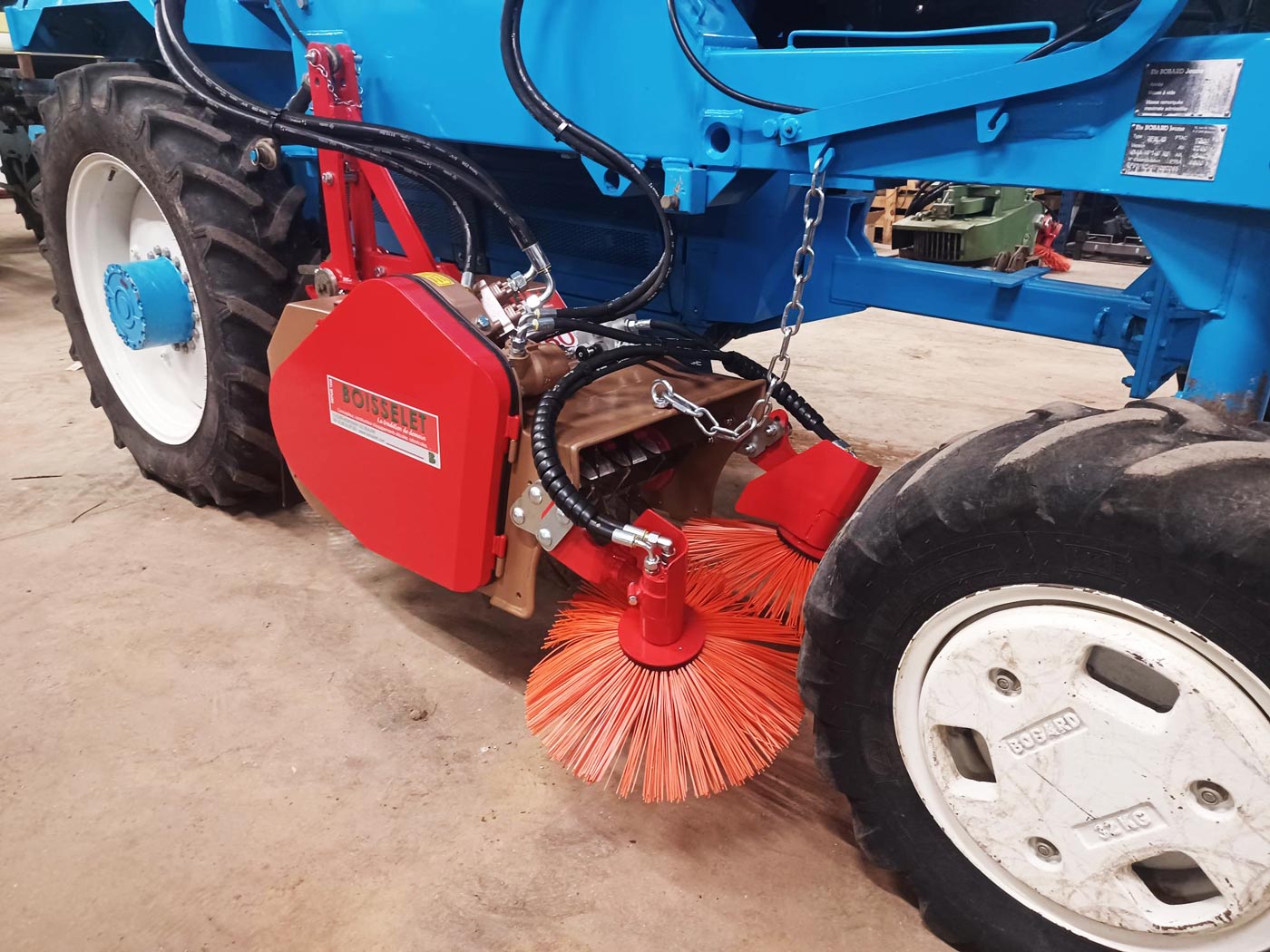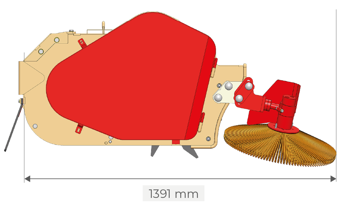 L’andaineur de bois de taille a été conçu pour pouvoir se monter directement sur le broyeur dans un faible encombrement. L’entraînement hydraulique, pris sur le circuit du pick-up est réglable en vitesse de rotation permettant d’être ajusté en fonction de la vitesse d’avancement. Le balai circulaire de Ø 500 mm est constitué de poils durs et effleure le sol en permanence en tournant ce qui donne une efficacité maximum à l’outil.