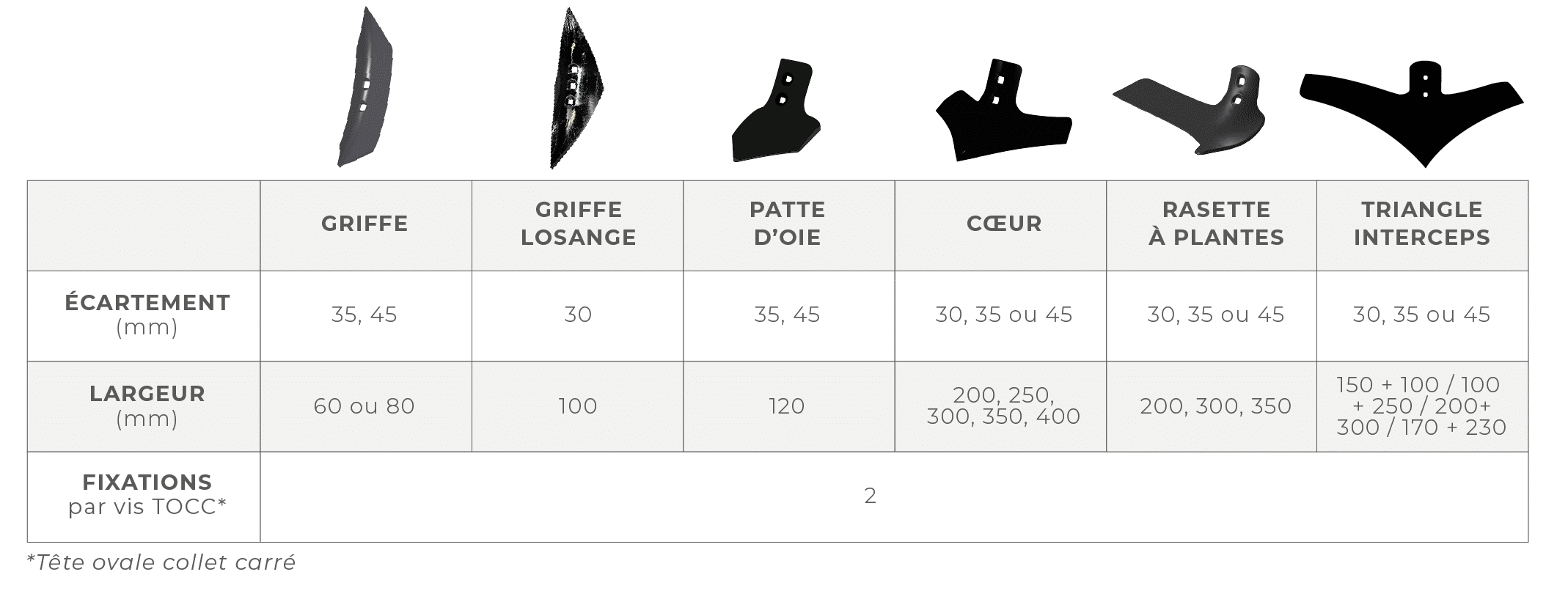 « Dans notre atelier forge, les forgerons façonnent toute une gamme de « socs » de griffage et binage, ainsi que des « étançons » (supports de socs) de différents modèles (hauteur, déport), dont la qualité a fait leur réputation. Il est ainsi possible de réaliser de nombreux montages et répondre à de nombreuses situations.