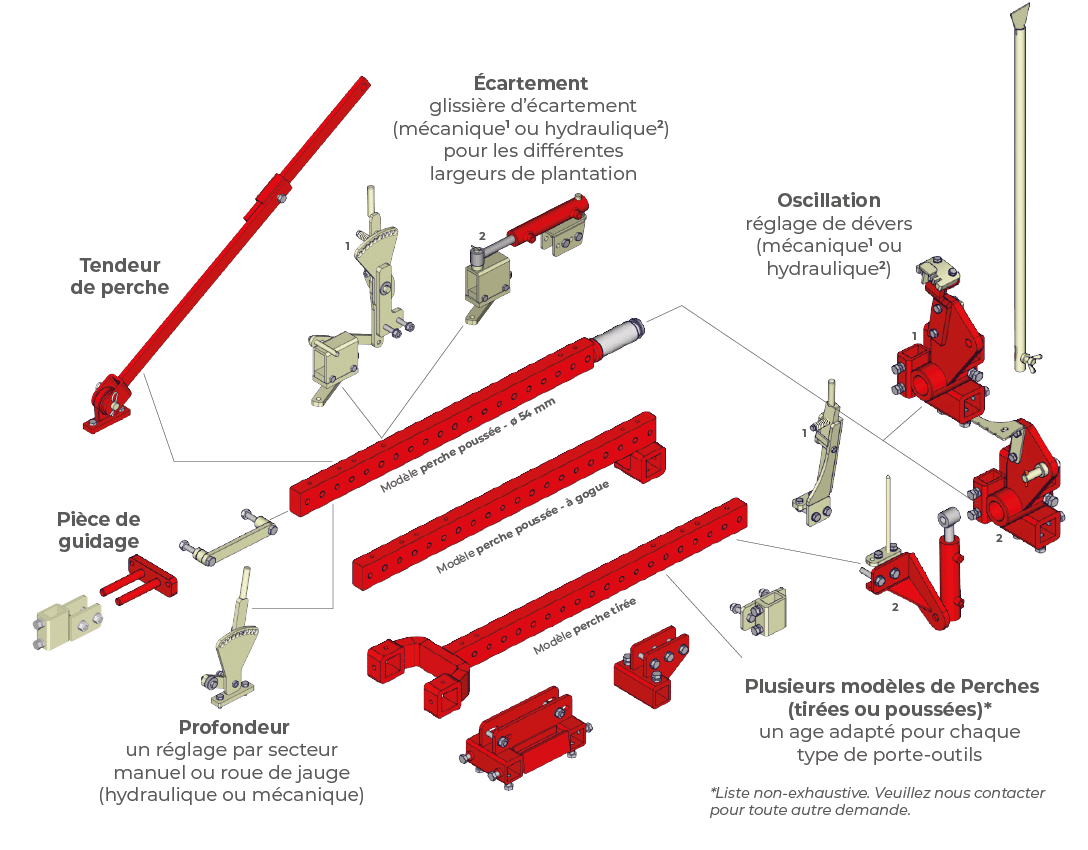 Pour aborder au mieux la mise en œuvre des équipements, nous devons nous assurer que le tracteur enjambeur est pourvu de porte-outils entre les roues. Ceux-ci, sont soit de type poussé ou tiré et à fixation boulonnée ou accroche rapide.