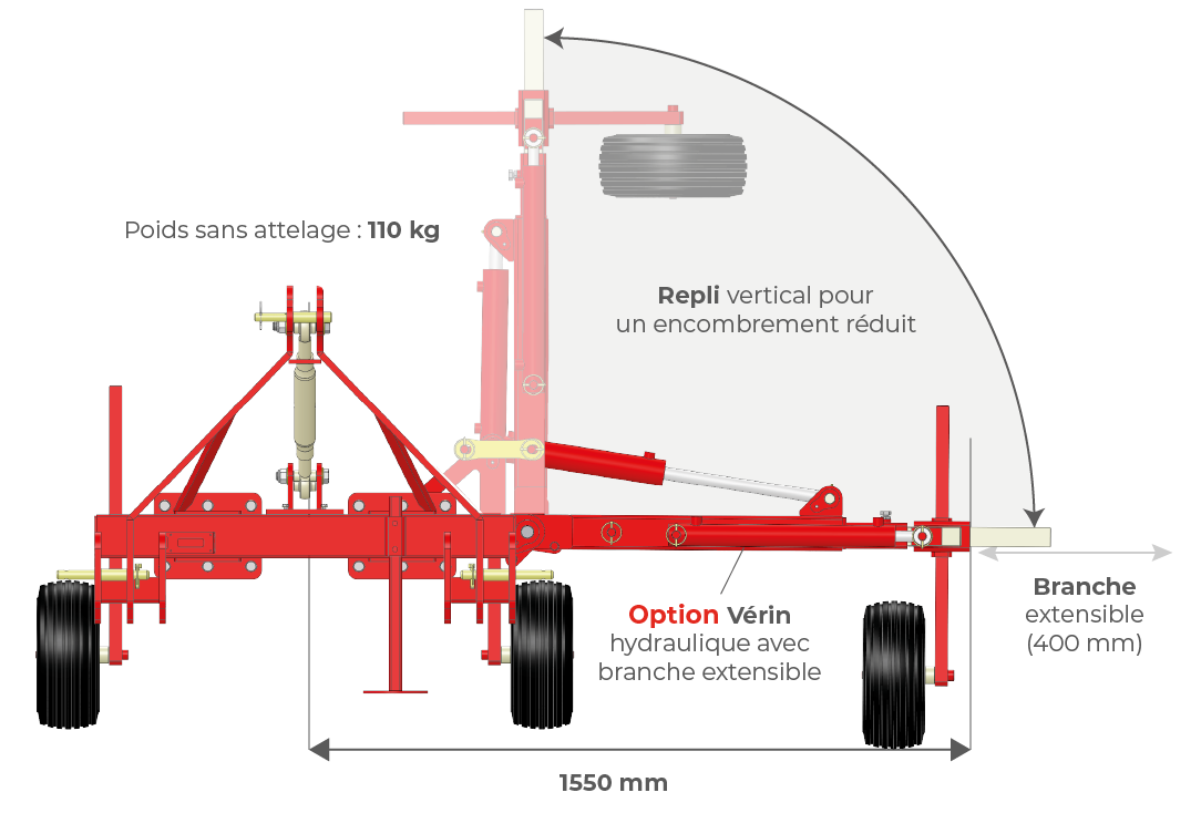 Grâce aux différentes fixations, il permet d’utiliser une tête d’andaineur ou d’effectuer des travaux de tonte dans les plantations larges. L’effacement peut être soit mécanique, soit hydraulique avec servomoteur EVO4. »