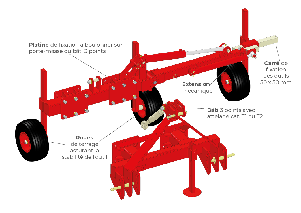 « Le PORTE-OUTILS ARBO LÉGER peut se monter sur le relevage avant ou arrière d’un tracteur, ainsi qu’en position frontale fixe.